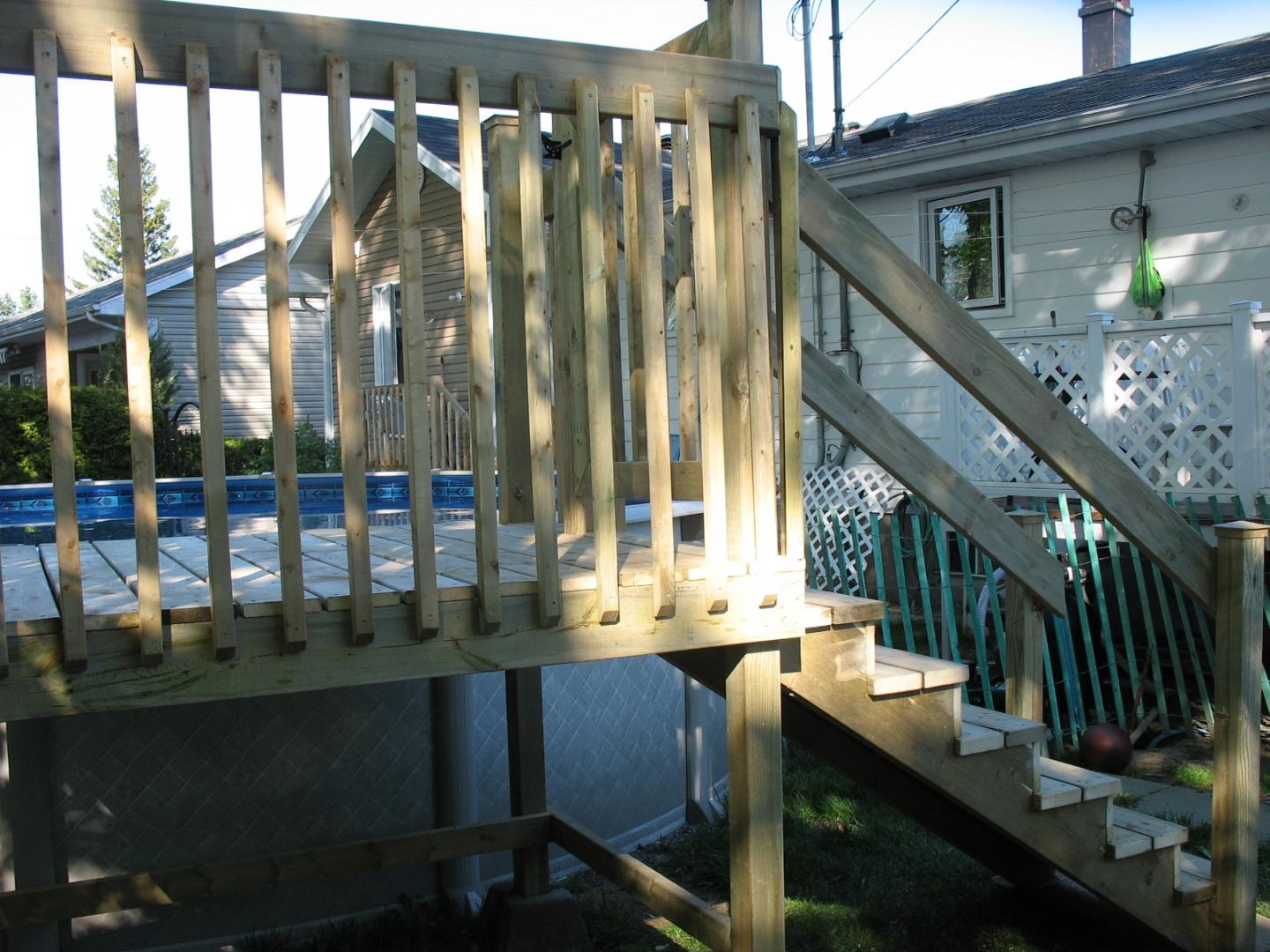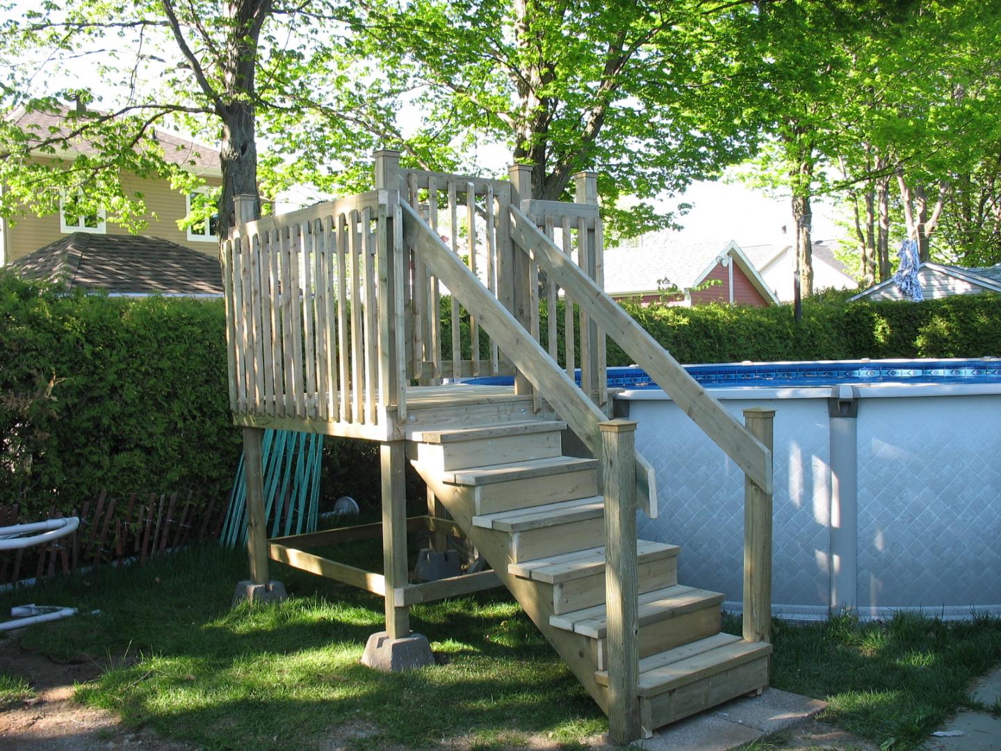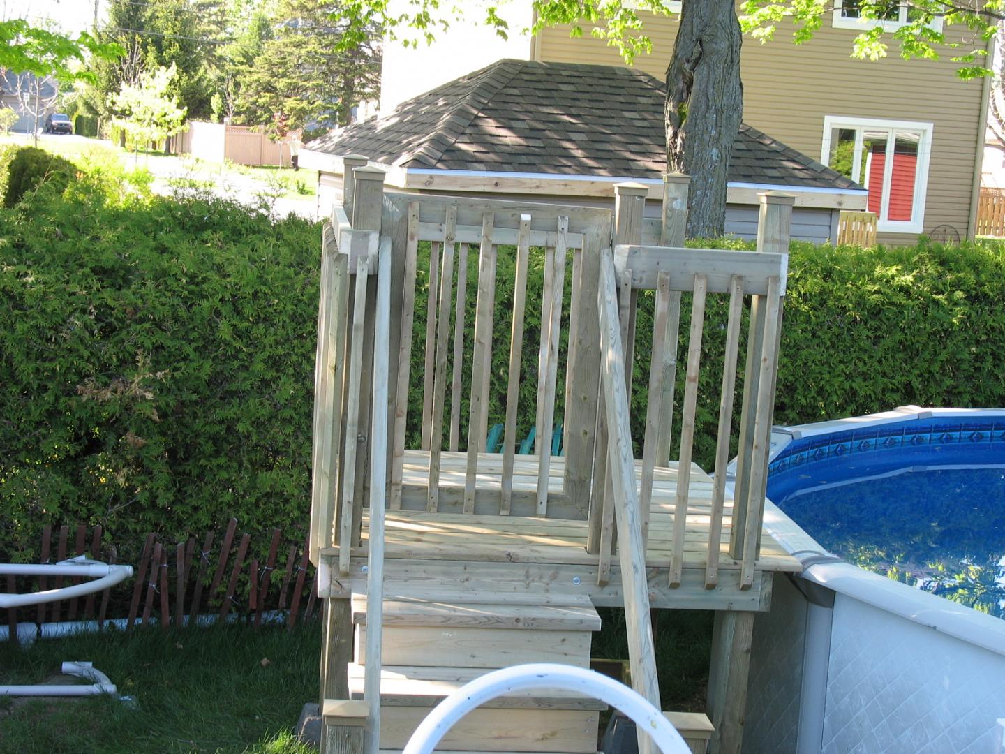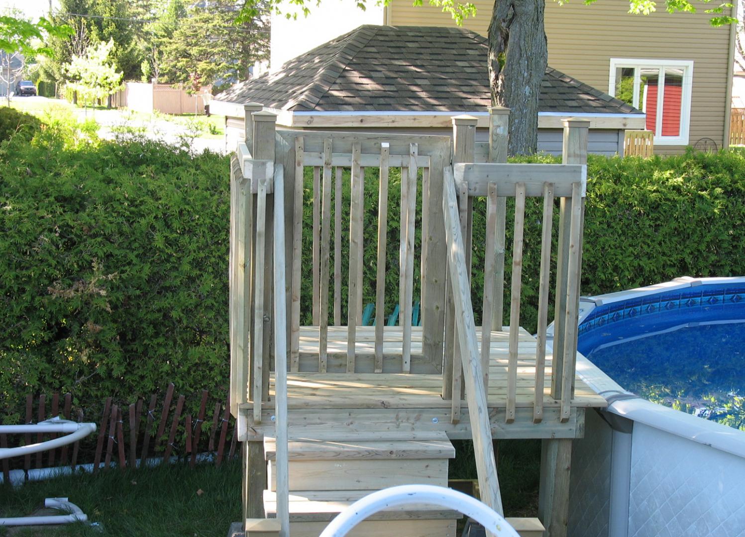 Deck de piscine en bois traité.