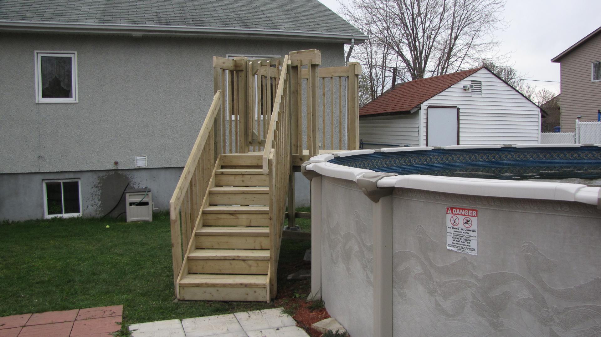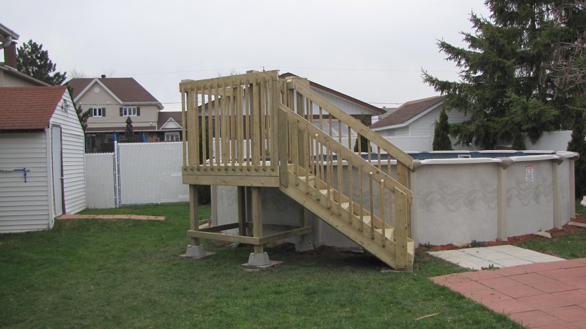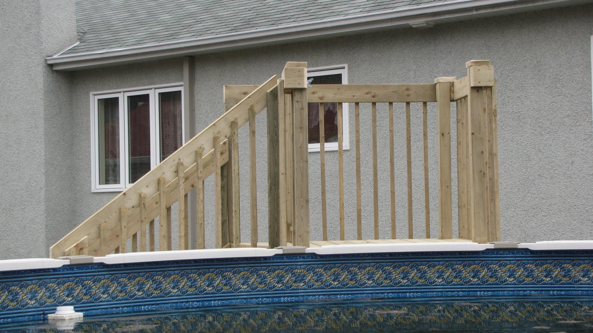 Deck de piscine fabriqué en bois traité dans notre atelier à Victoriaville et livré directement chez le client à Boisbriand, dans les Basses-Laurentides.