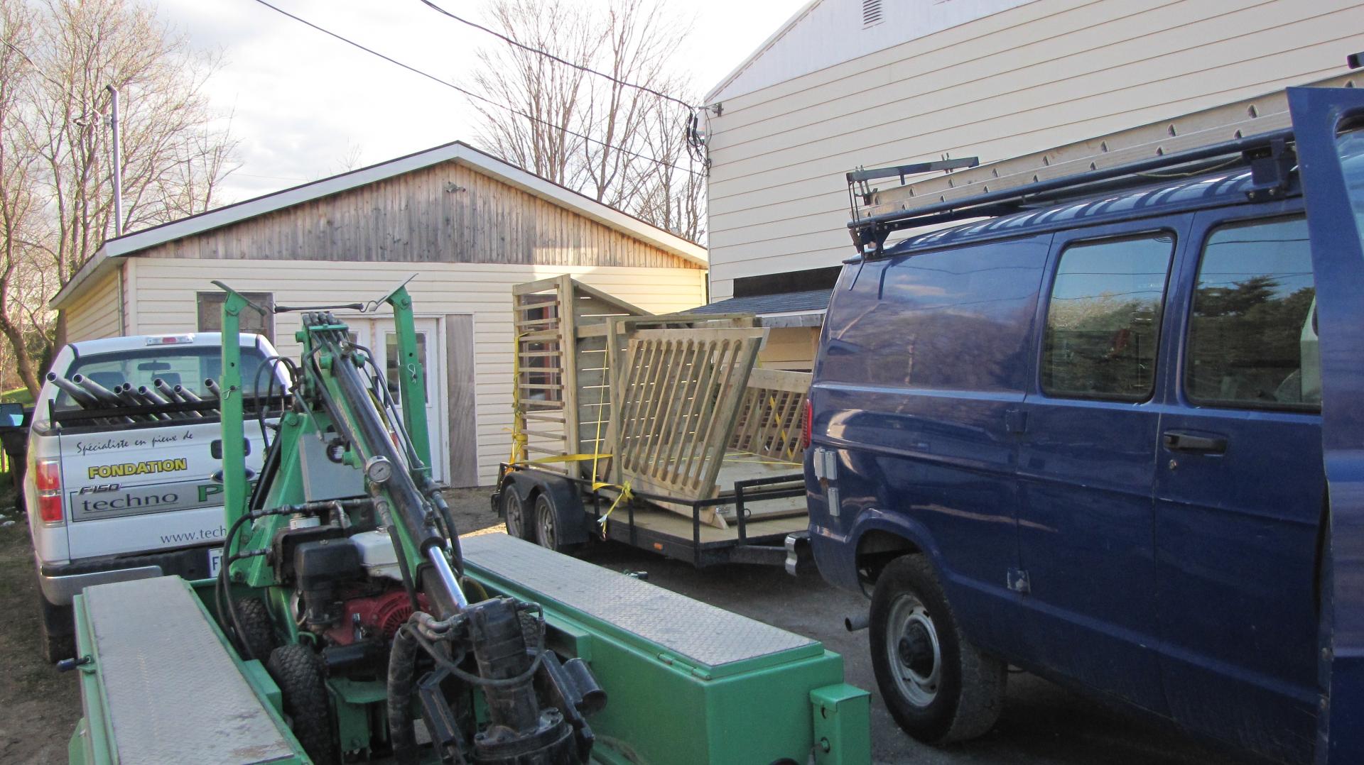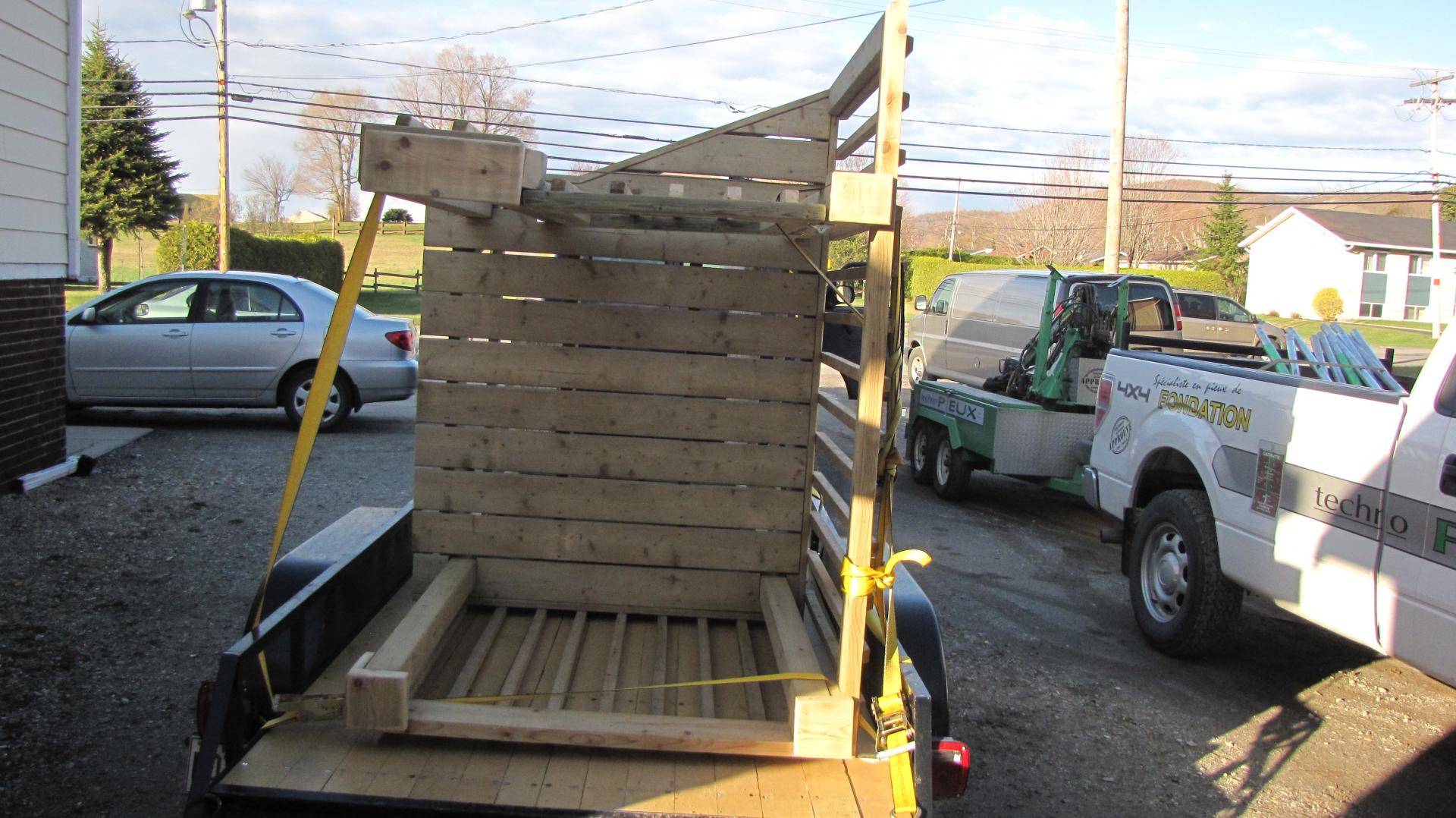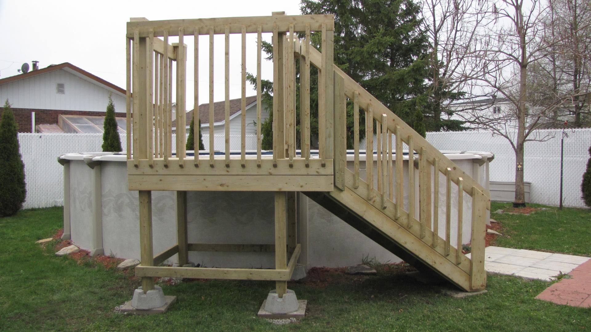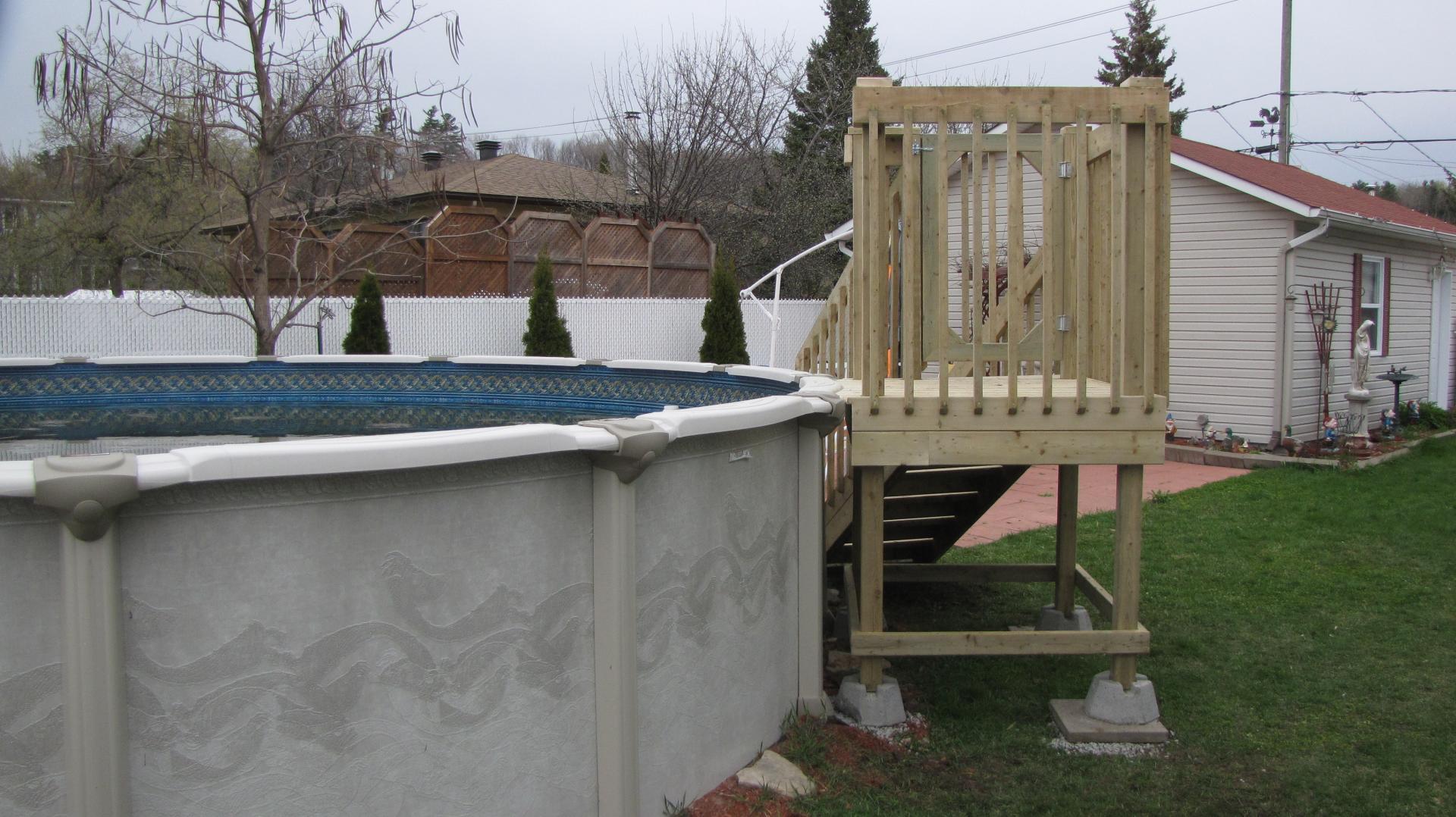 Deck de piscine fabriqué en bois traité dans notre atelier à Victoriaville et livré directement chez le client à Boisbriand, dans les Basses-Laurentides.