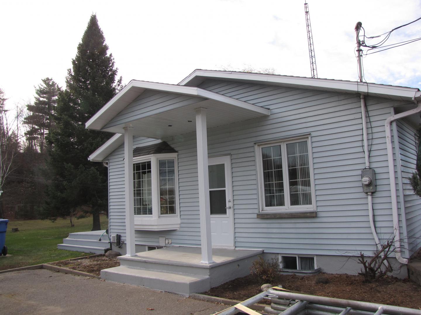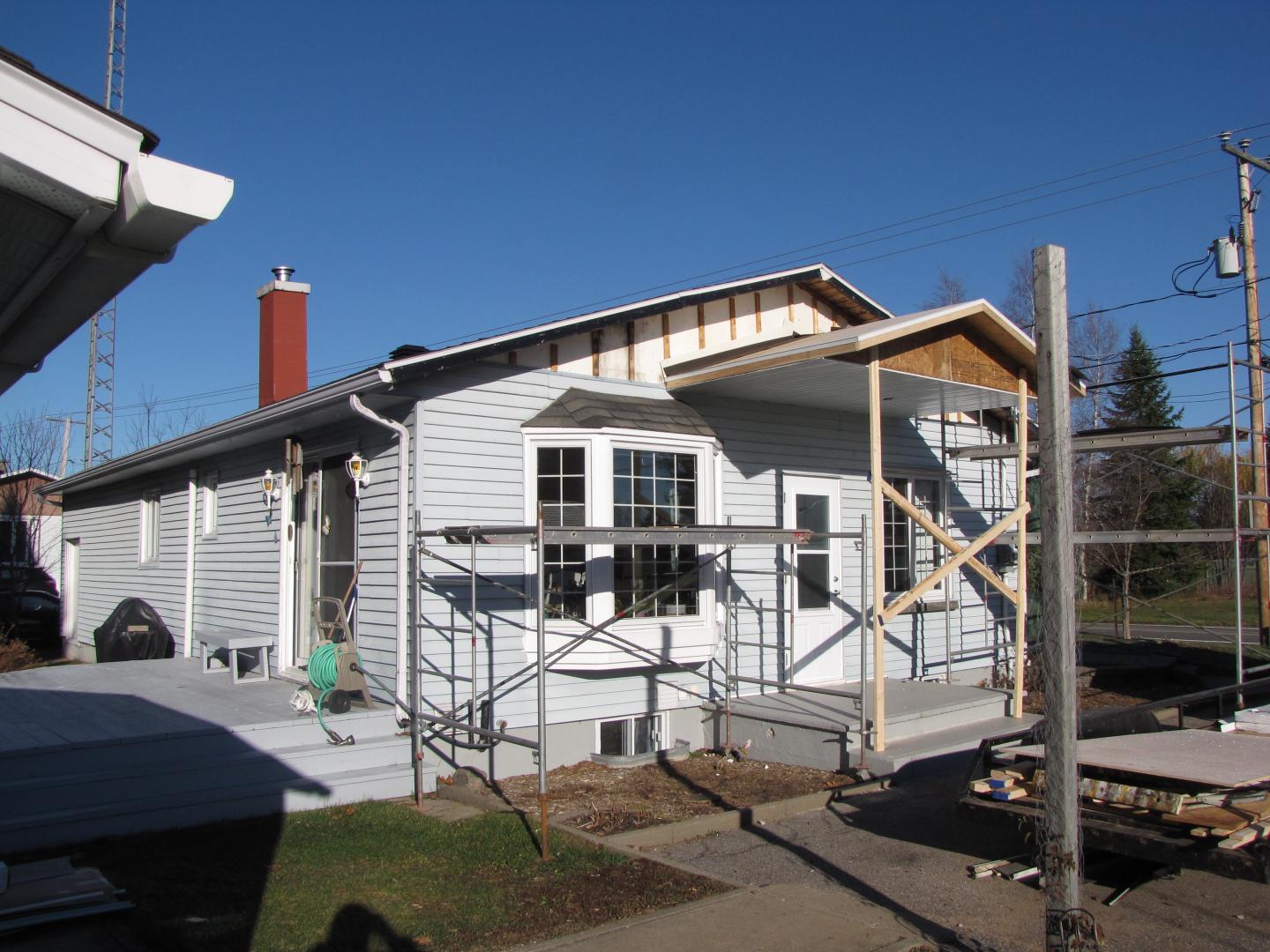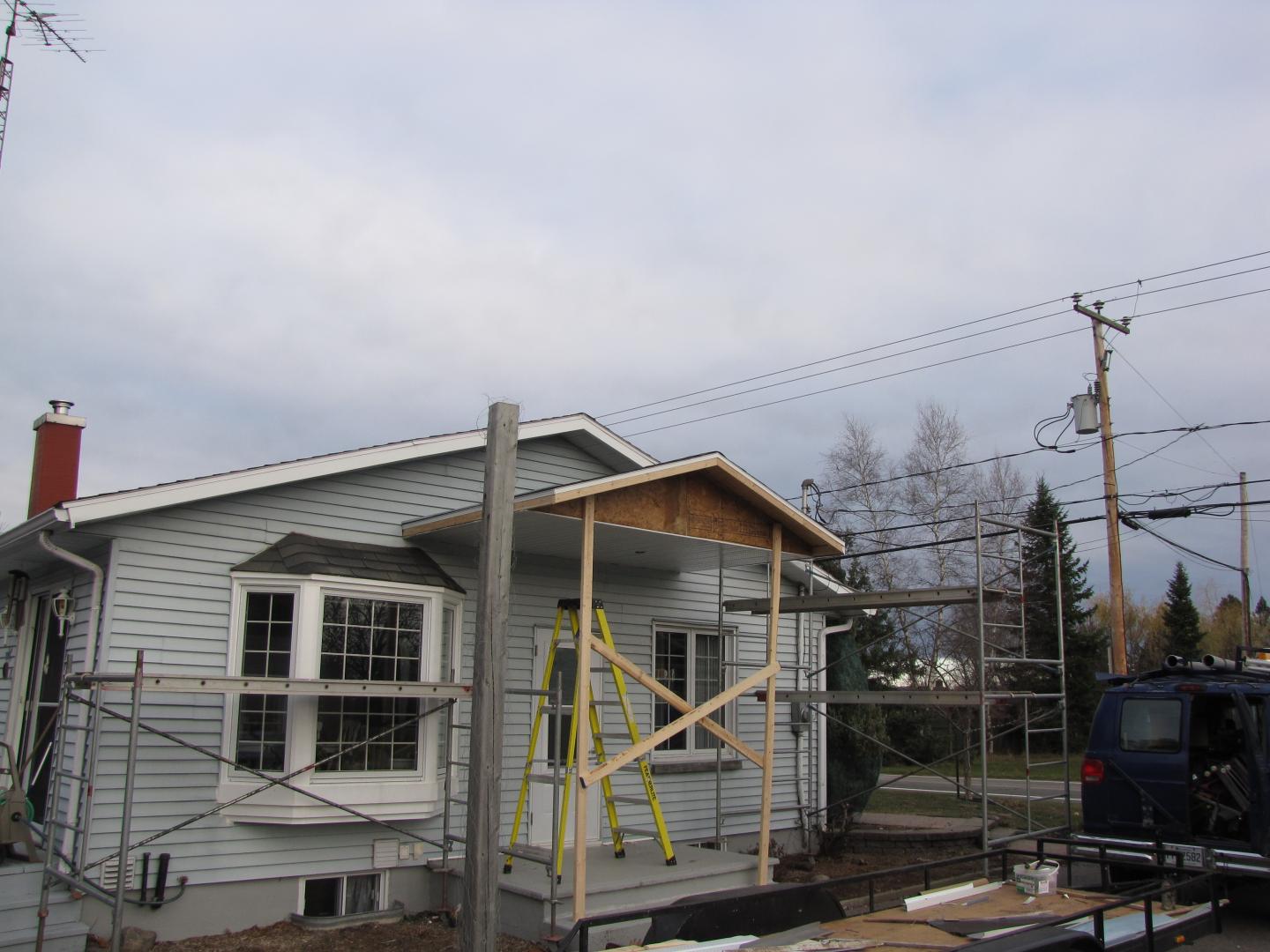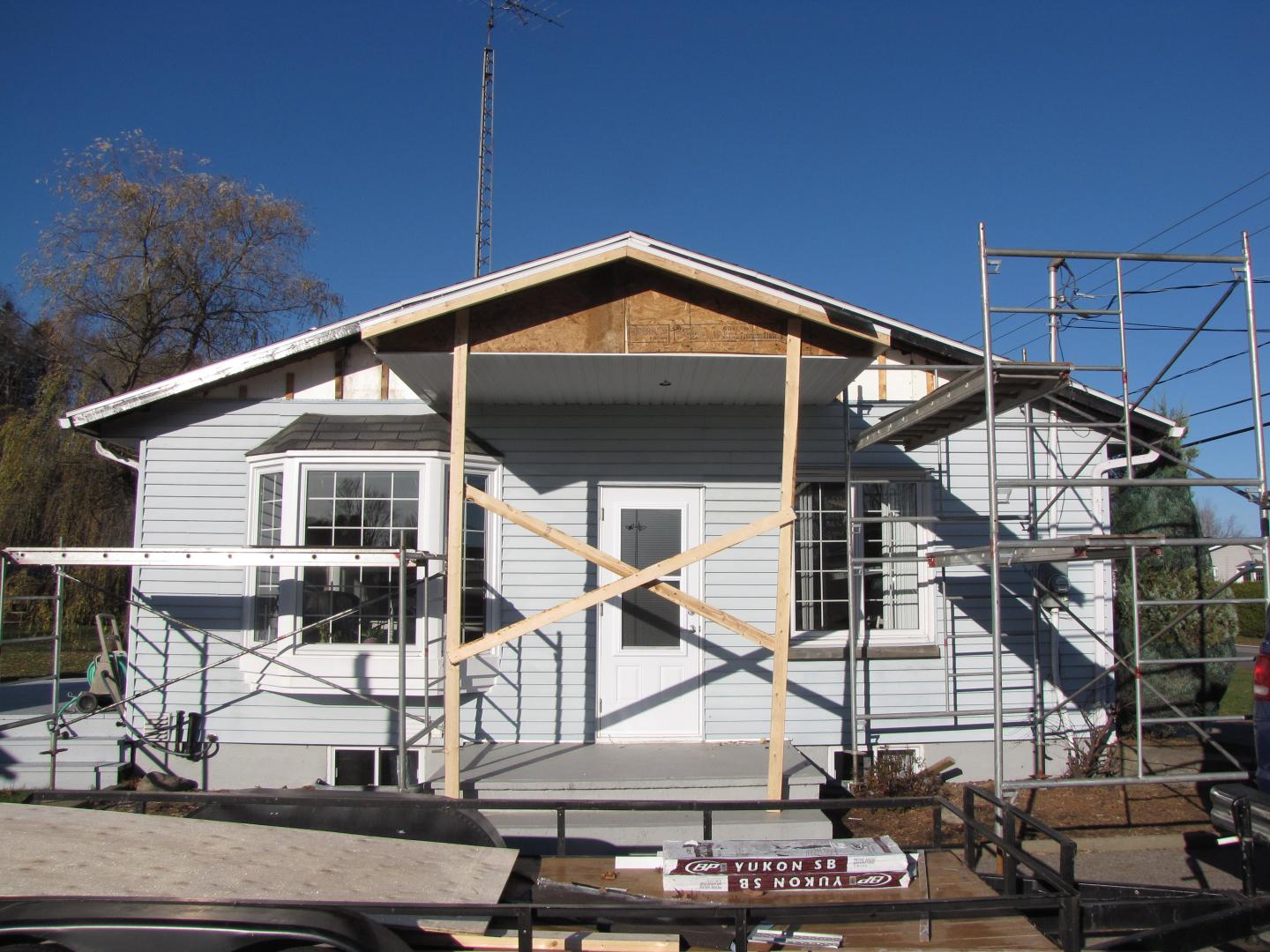 Toiture pour galerie avec colonnes en alumimium. Toit en bardeaux d'asphalte pareil à la maison.