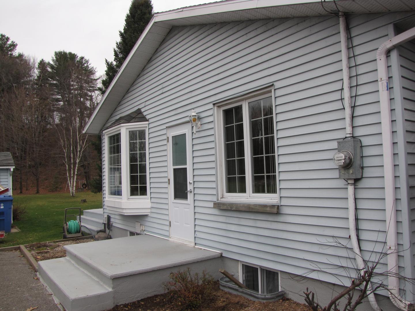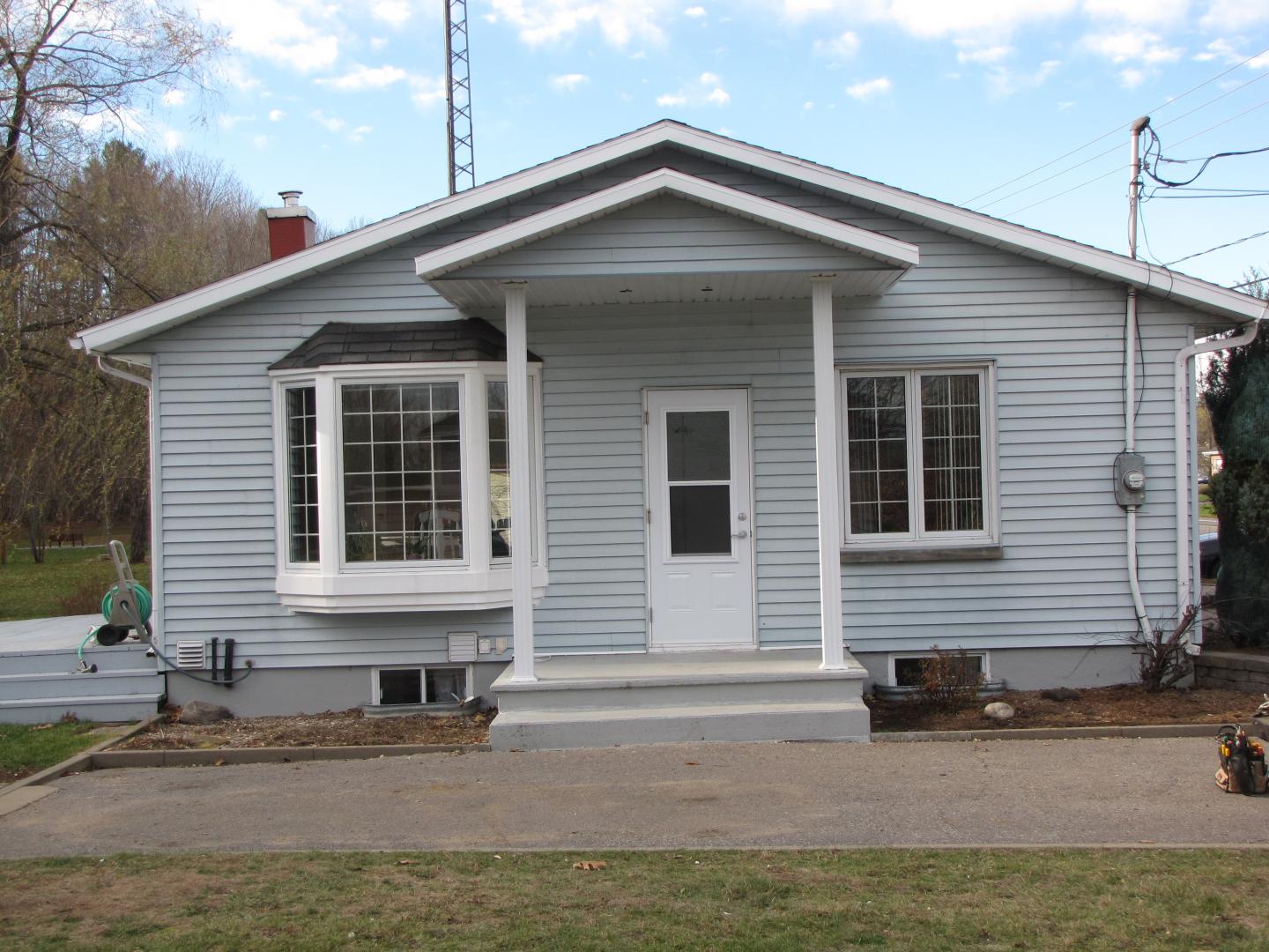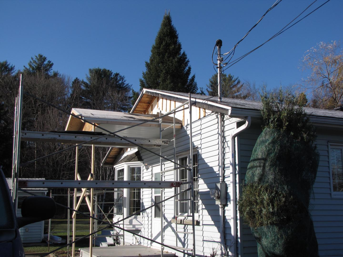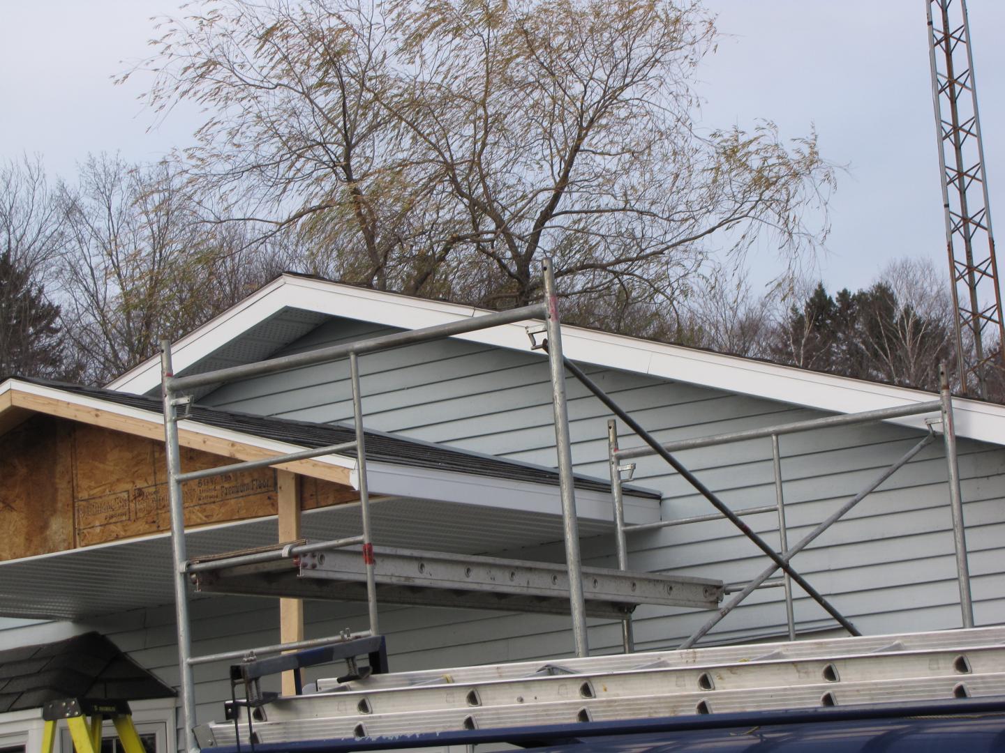 Toiture pour galerie avec colonnes en alumimium. Toit en bardeaux d'asphalte pareil à la maison.